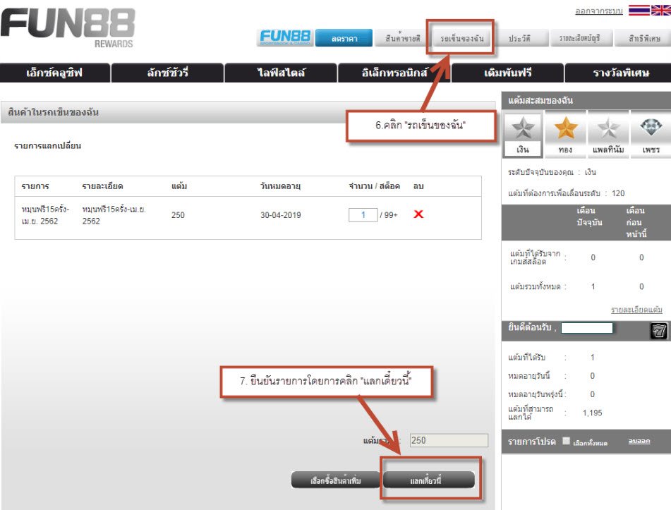 6.หลังจากที่เราเลือกของรางวัลที่ต้องการจะแลกเรียบร้อยแล้ว โดยการกดปุ่มใส่รถเข็นในรางวัลที่ต้องการจะแลก ให้เราเลือกเมนู “รถเข็นของฉัน” ที่อยู่ในเมนูด้านบน