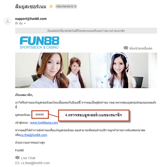 4.เข้าไปที่อีเมลของเรา (อีเมลที่กรอกในตอนสมัคร) หากไม่พบอีเมล ให้ลองเข้าไปหาใน Junk ของอีเมลดู เมื่อเจออีเมล ที่ทาง FUN88 ส่งให้แล้ว เนื้อหาด้านใน จะมีข้อมูล ยูสเซอร์เนม ของเราอยู่ (ตามรูปด้านบน)